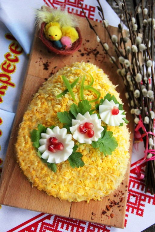 Дальше включаем фантазию и украшаем салатик. Я вырезала "ХВ" из болгарского перца и сделала цветочки из яичного белка, украсила зёрнышками граната и листиками петрушки (эти яйца, болгарский перец, гранат и петрушка не включены в ингредиенты, я их использовала для украшения). Вот такой красивый, очень вкусный и нежный салат "Пасхальное яйцо" получился.