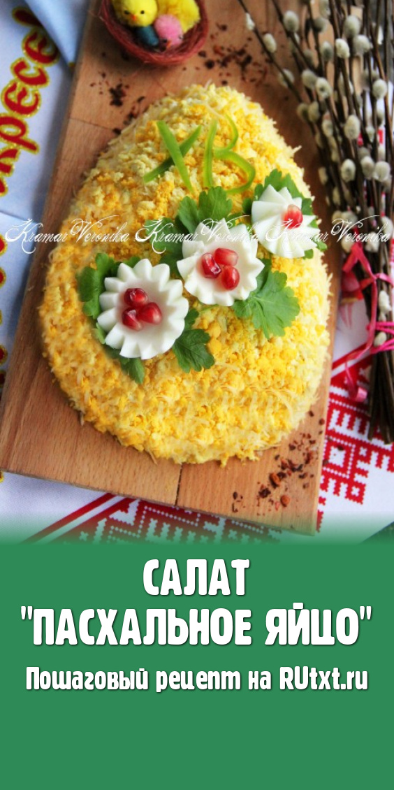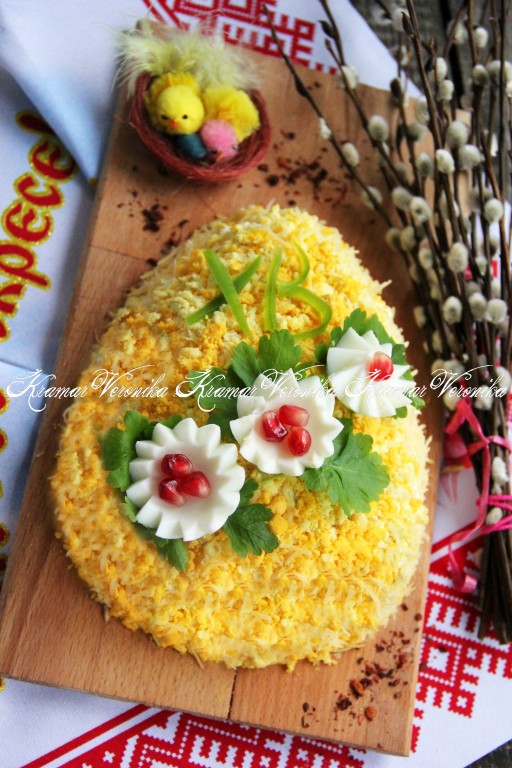 На Пасху к праздничному столу можно приготовить красивый салат в виде пасхального яйца. Салатик получается очень красивым, вкусным и нежным. Я украсила салат цветочками из яичного белка. По желанию, можно украсить салатик веточками зелени или цветным перцем. Всем советую приготовить этот вкусный праздничный салат!