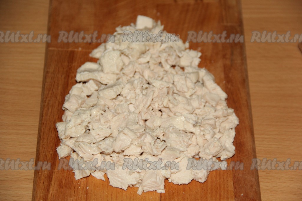 В подсоленной воде сварить куриное филе до готовности (варить минут 25-30). Затем остудить мясо в бульоне. Нарезать остывшее филе на небольшие кусочки (можно и просто порвать на волокна).