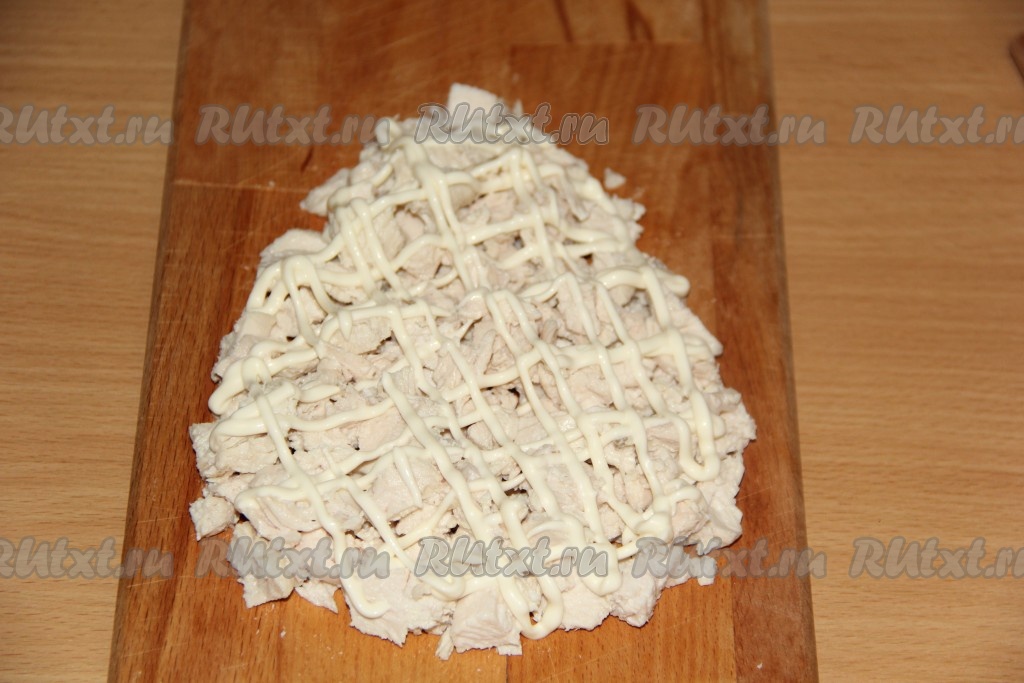 Слегка посолить куриное филе и нанести сетку из майонеза.