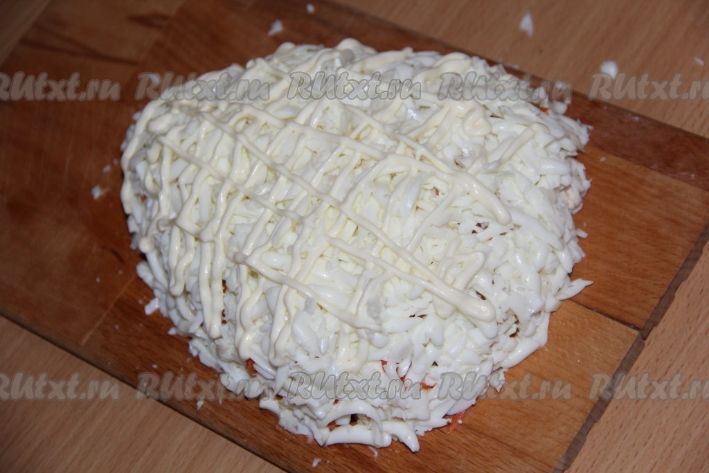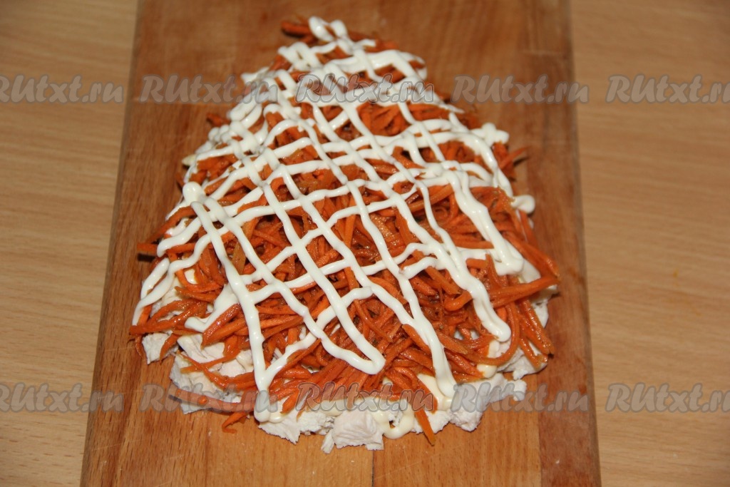 Морковь по-корейски (я использовала покупную корейскую морковку) разложить поверх мяса.