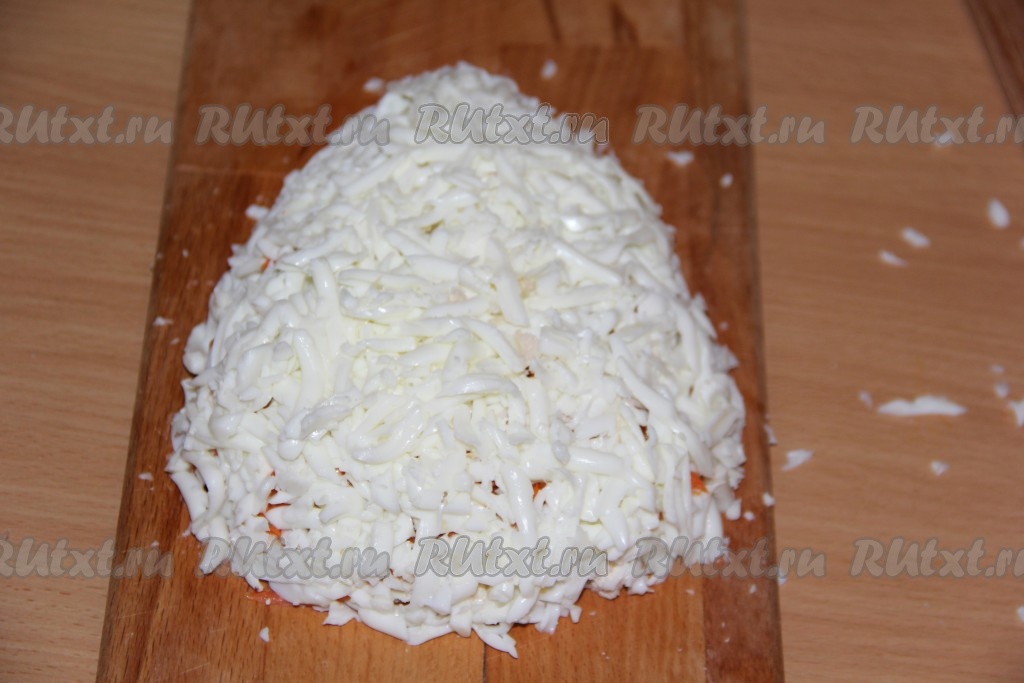 Предварительно сварить вкрутую 3 яйца (варить нужно минут 10), остудить. Затем очистить яйца и разделить на белки и желтки. Натереть белки на тёрке и покрыть ими салат.