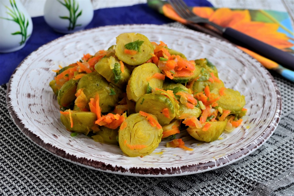 Аппетитную, очень вкусную брюссельскую капусту, тушёную с овощами, подавать можно и в тёплом, и в охлаждённом виде. Это блюдо точно понравится многим!