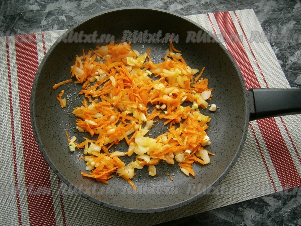 Обжарить лук с морковью на разогретом растительном масле на среднем огне в течение 3 минут, помешивая. Овощи не должны поджариваться, они должны только обмякнуть.