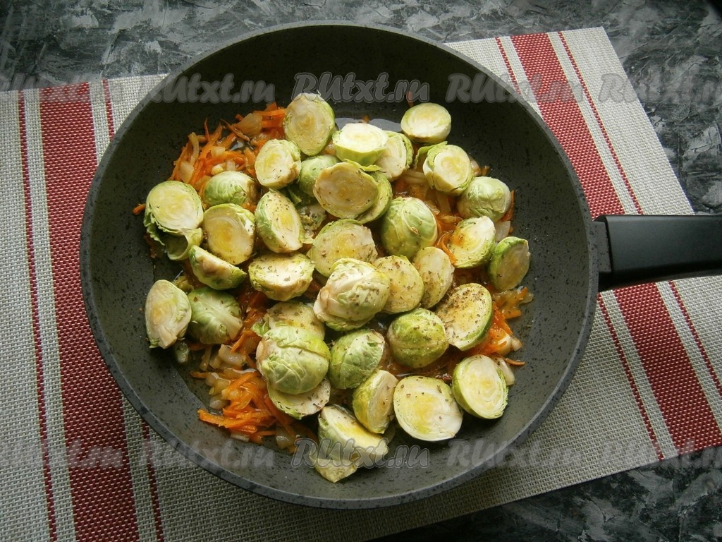 Перемешать, накрыть сковороду крышкой и тушить брюссельскую капусту с овощами на небольшом огне в течение минут 15. Затем добавить измельчённую зелень петрушки и мелко нарезанный чеснок, перемешать, потушить блюдо ещё 2 минуты и выключить газ.