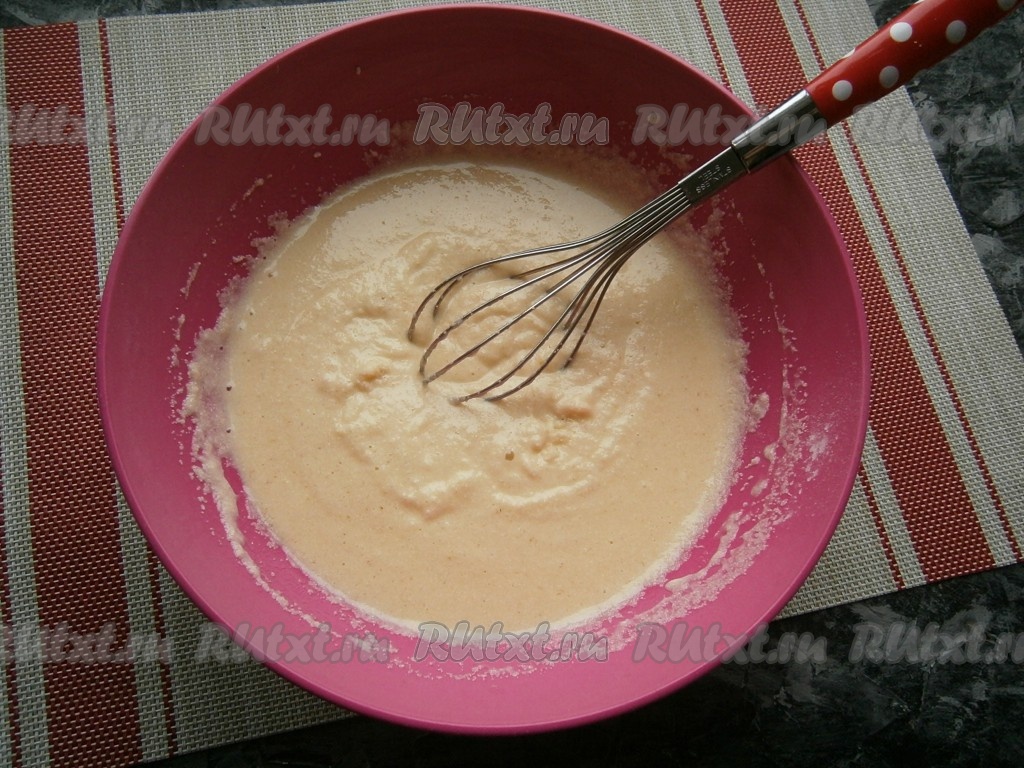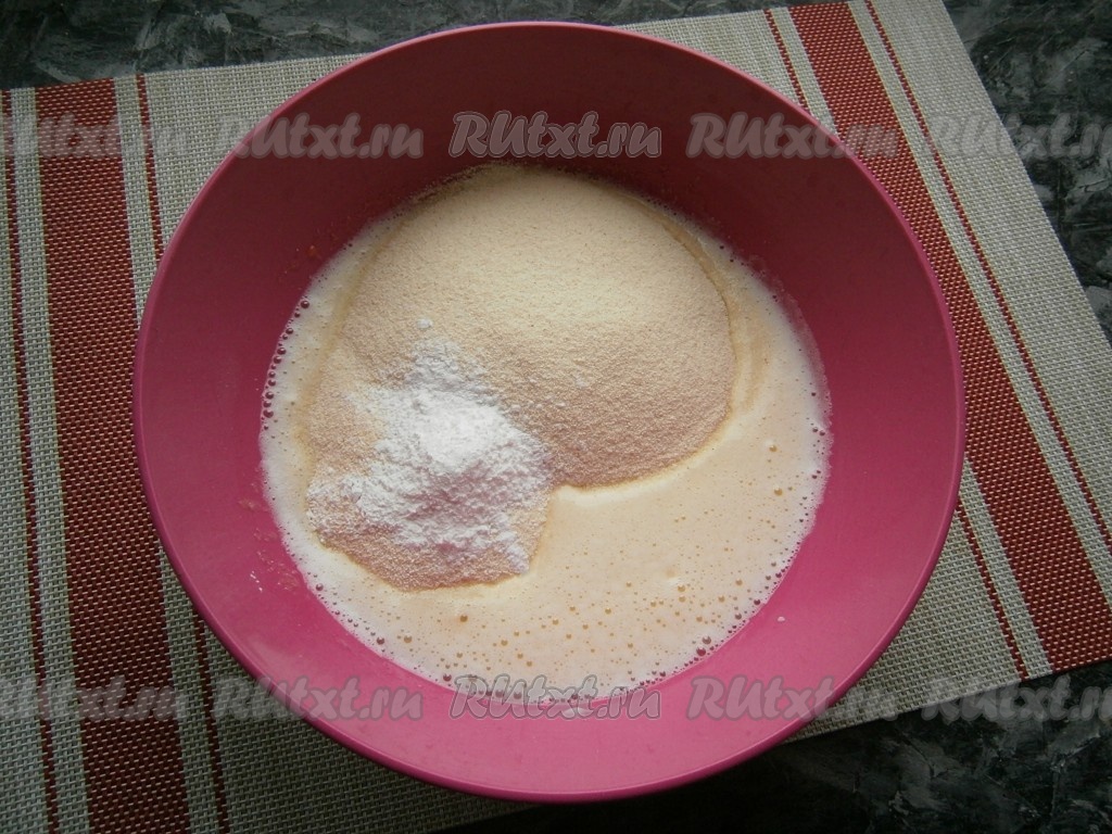 Ещё раз перемешать венчиком, всыпать 300 грамм манной крупы и разрыхлитель.