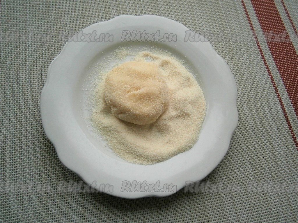 Далее влажными руками из этой массы скатать шарики любого удобного для вас размера, сформировать лепёшки и обвалять их в манной крупе.