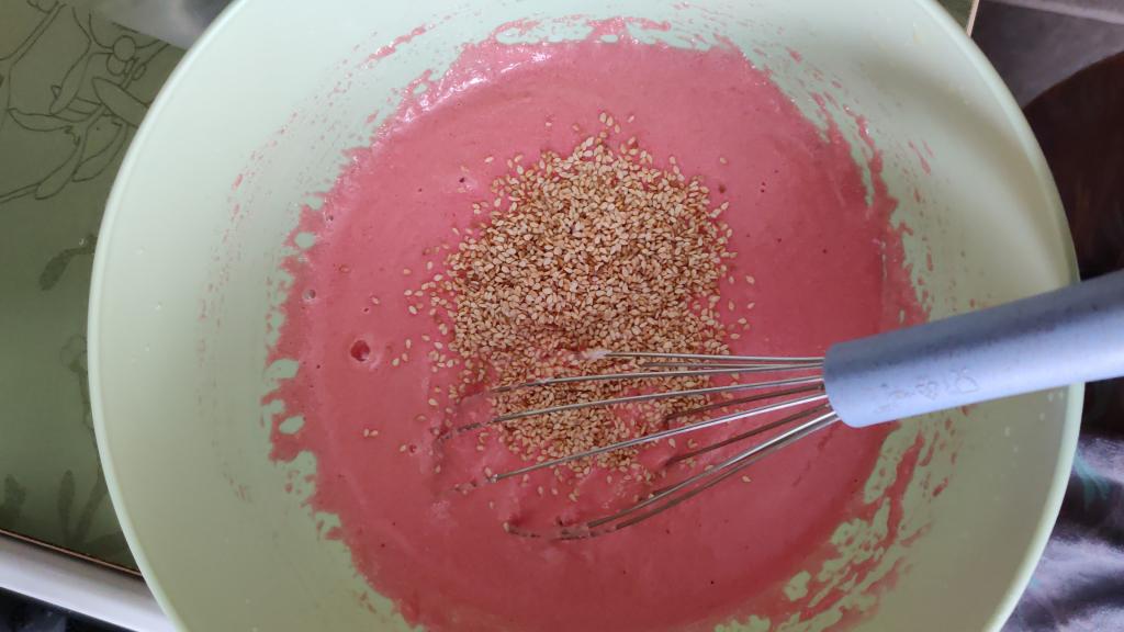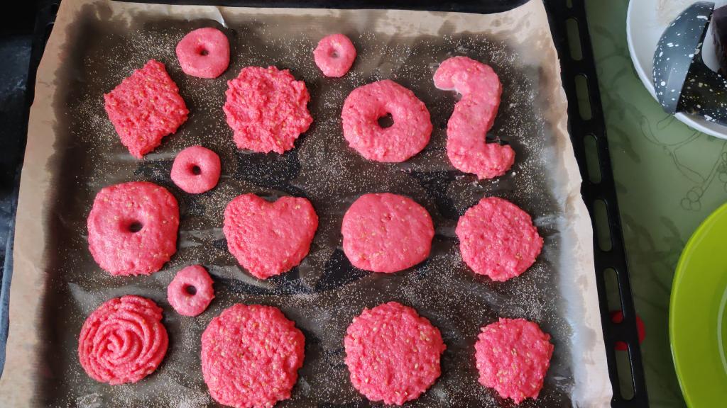 Я в рецепт добавила немного капель красителя и получился вот такой цвет) обжарила кунжут и добавила в тесто. Поставила в духовку и жду... На пробу оооочень вкусно... В манке не обваливала. Пергамент смазал чуть маслом и посыпала манкой. Формовала печенья так: поставила кружку с холодной водой и совсем немного смачивала пальцы. Нижние печенья просто с помощью ложки формовала,они от того интереснее стали,тесто липкое и они получились как "ёжик")