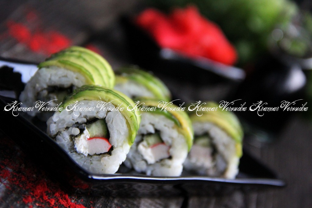 Роллы, приготовленные в домашних условиях, получаются вкусными и нежными. С начинками и оформлением можно экспериментировать снова и снова. Предлагаю рецепт очень красивых и вкусных роллов с авокадо и крабовыми палочками. Авокадо лучше выбирать мягкое. Можно поместить авокадо внутрь роллов, а я решила выложить его сверху. В результате роллы получились не только вкусными, но и очень аппетитными. Уверена, такие роллы точно понравятся и вам, и вашим близким!