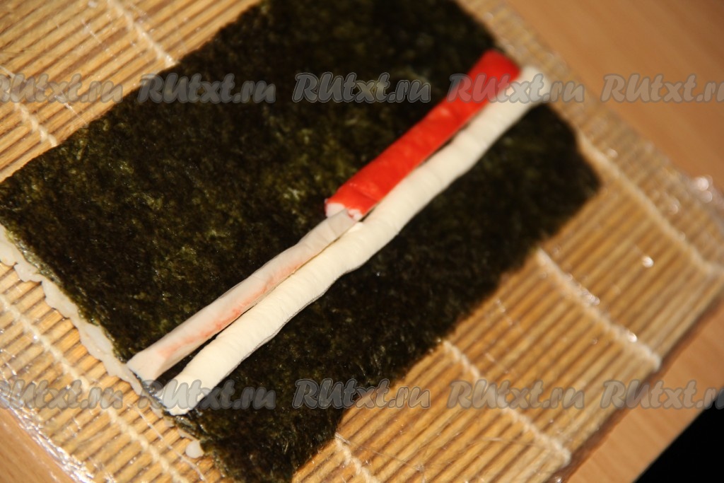 Затем лист нори нужно перевернуть так, чтобы рис оказался внизу. Отступив немного от края нори, ближе к стороне, на которую не выкладывали рис, выложить полоску творожного сыра (для того чтобы полоска сыра была ровной, я выкладываю сыр в кулинарный мешок, а затем выдавливаю его на нори) и брусочки крабовых палочек (как на фото).