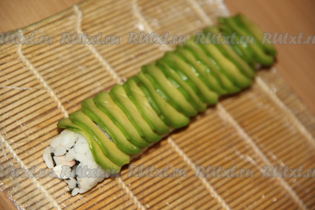 Авокадо разрезать на две части и удалить косточку. Очистить авокадо от кожуры и тонко нарезать мякоть. Выложить кусочки авокадо внахлёст поверх риса.