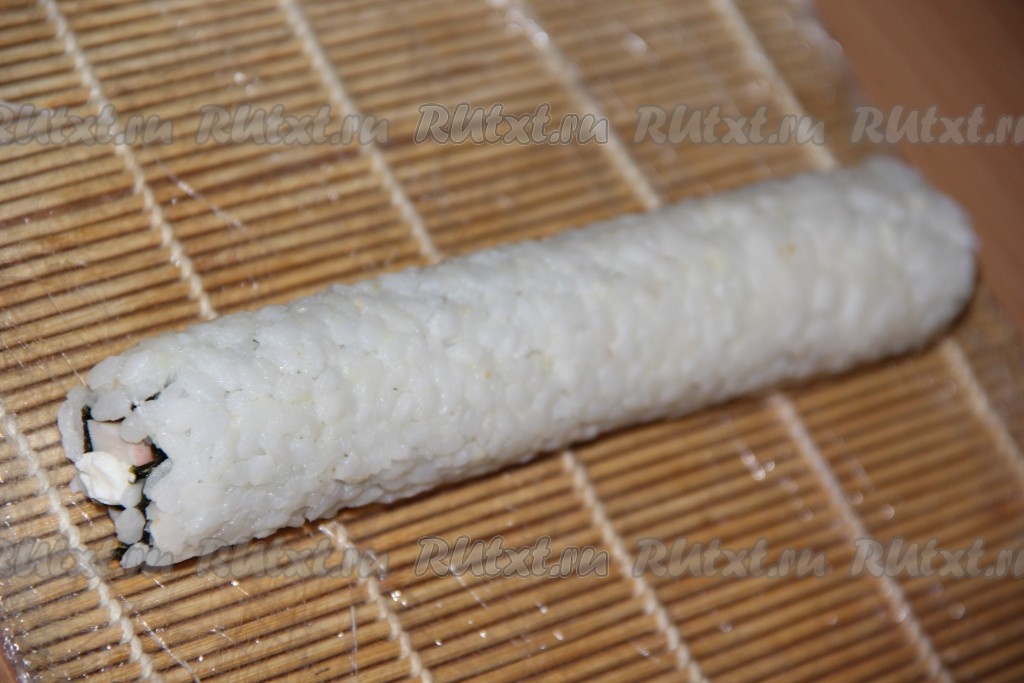 С помощью циновки завернуть плотный ролл. Заворачиваем, начиная со стороны с рисом, а пустая полоска листа нори закрепляет ролл.