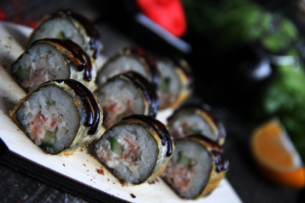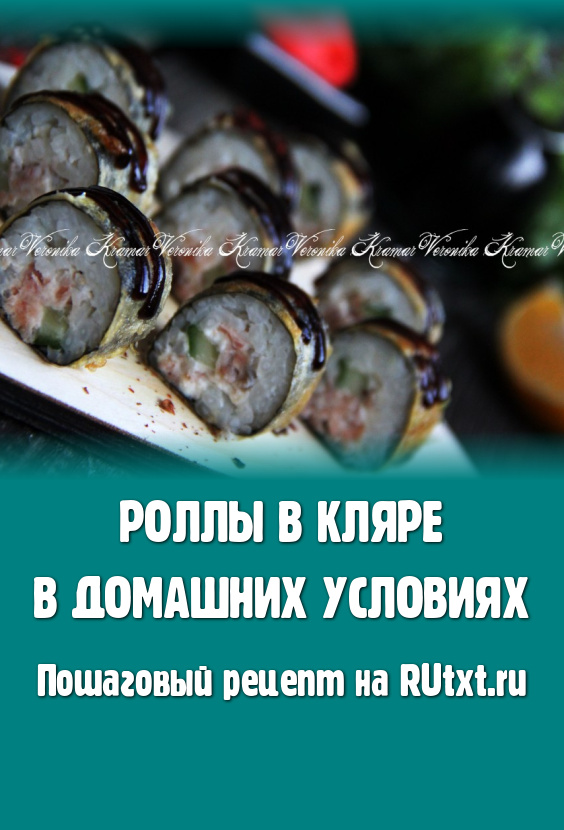 Каждый ролл, обжаренный в кляре, переложить на доску и разрезать на 6 (или 8) кусочков. В результате у меня получилось 18 штук. Очень вкусные и сытные роллы, приготовленные в кляре в домашних условиях, можно подать к столу и тёплыми, и остывшими, дополнив соевым соусом и имбирём.