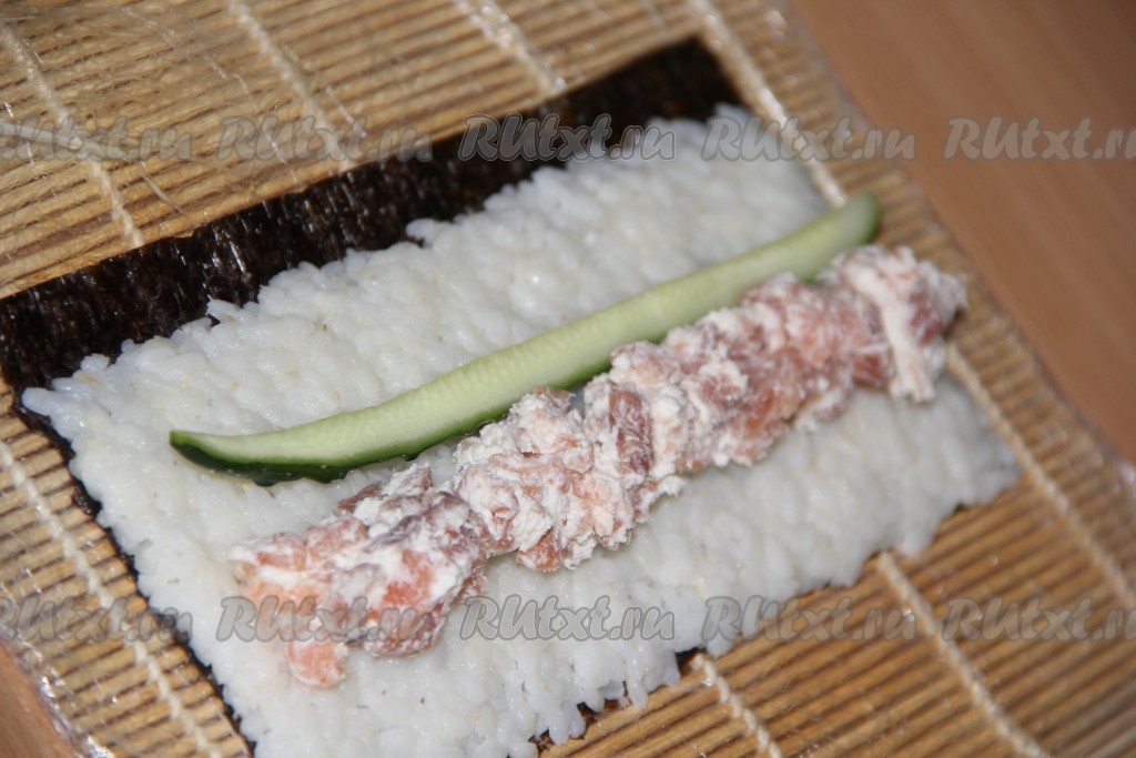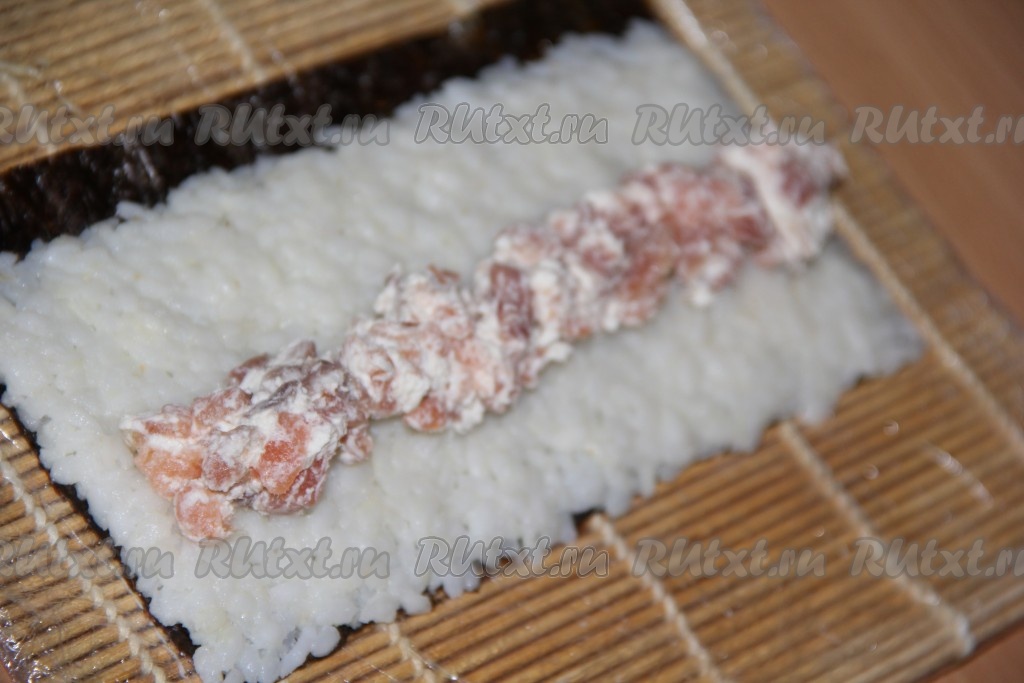 Затем отступив от края с рисом несколько сантиметров, выложить часть рыбной начинки по всей длине (как на фото).