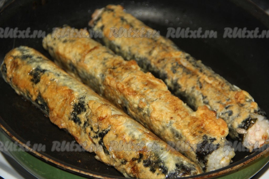 Яйца поместить в тарелку и слегка взбить вилкой, можно слегка посолить. Обмакнуть каждый ролл в яичную массу и выложить на горячую сковороду, хорошо разогретую с растительным маслом.
