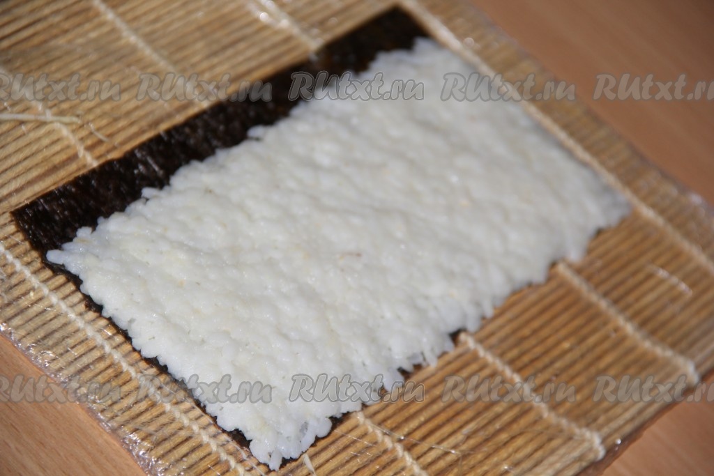 Разрезать лист нори на две части. Половину листа нори выложить на циновку блестящей стороной вниз. Равномерно распределить рис по листу, оставив с одного края 1 см листа свободным. Толщина риса должна быть, примерно, 5 мм.