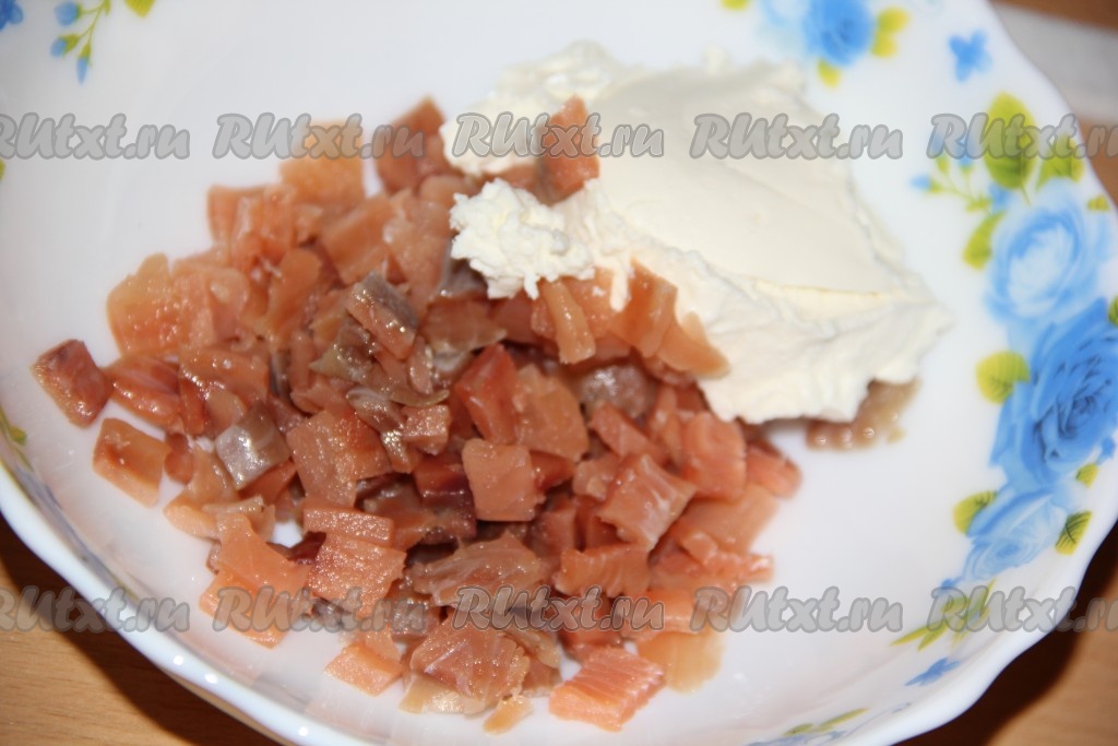 Добавить к рыбе творожный сыр и тщательно перемешать рыбную начинку.