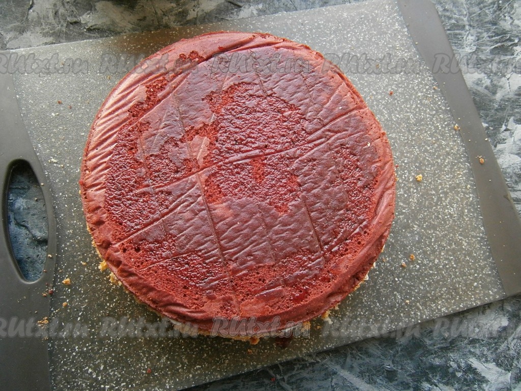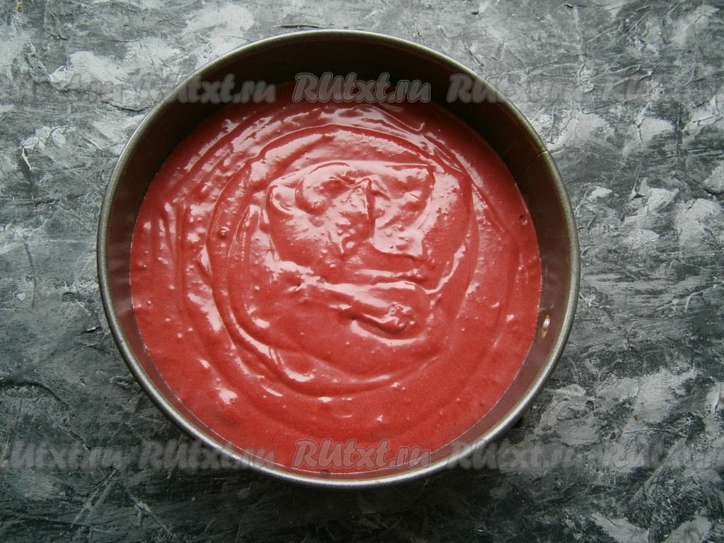 Испечь корж в разогретой до 160-170 градусов духовке в течение 35-40 минут. Дать ему немного остыть в форме, а затем, подрезая ножом края, извлечь и остудить корж "Красный бархат" на решётке.