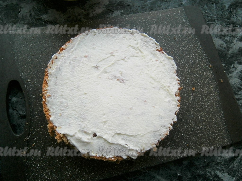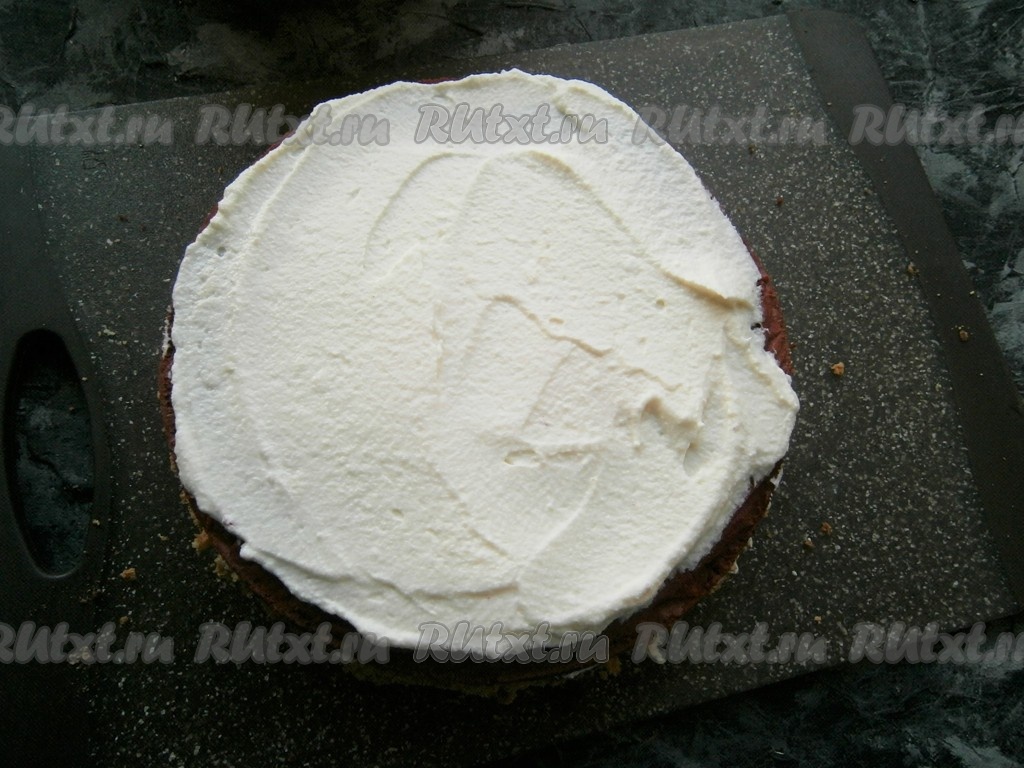 Теперь торт "Искушение" нужно собрать: нижнюю часть бисквита смазать кремом (сразу отложите немного крема и поместите в холодильник, этот крем понадобится в дальнейшем для украшения верха).