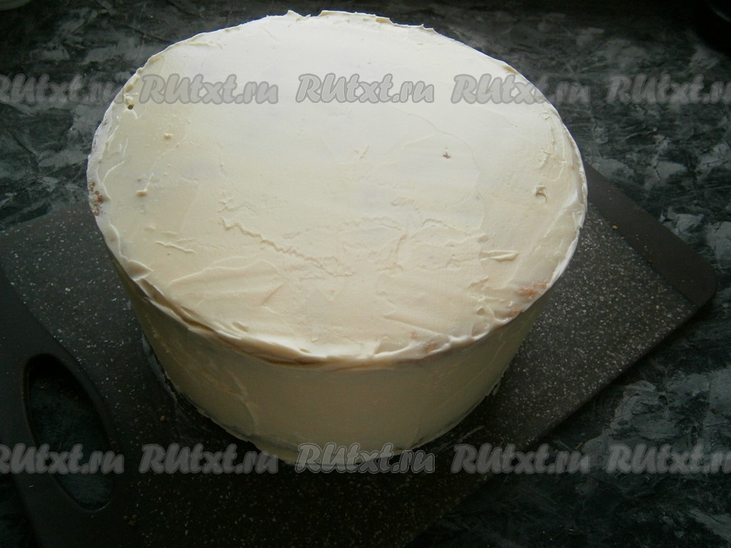 Эту часть белого бисквита, смазанную кремом, перевернуть кремом вниз и накрыть весть торт, немного утрамбовать (придавить руками) и отправить торт в холодильник на 2 часа.