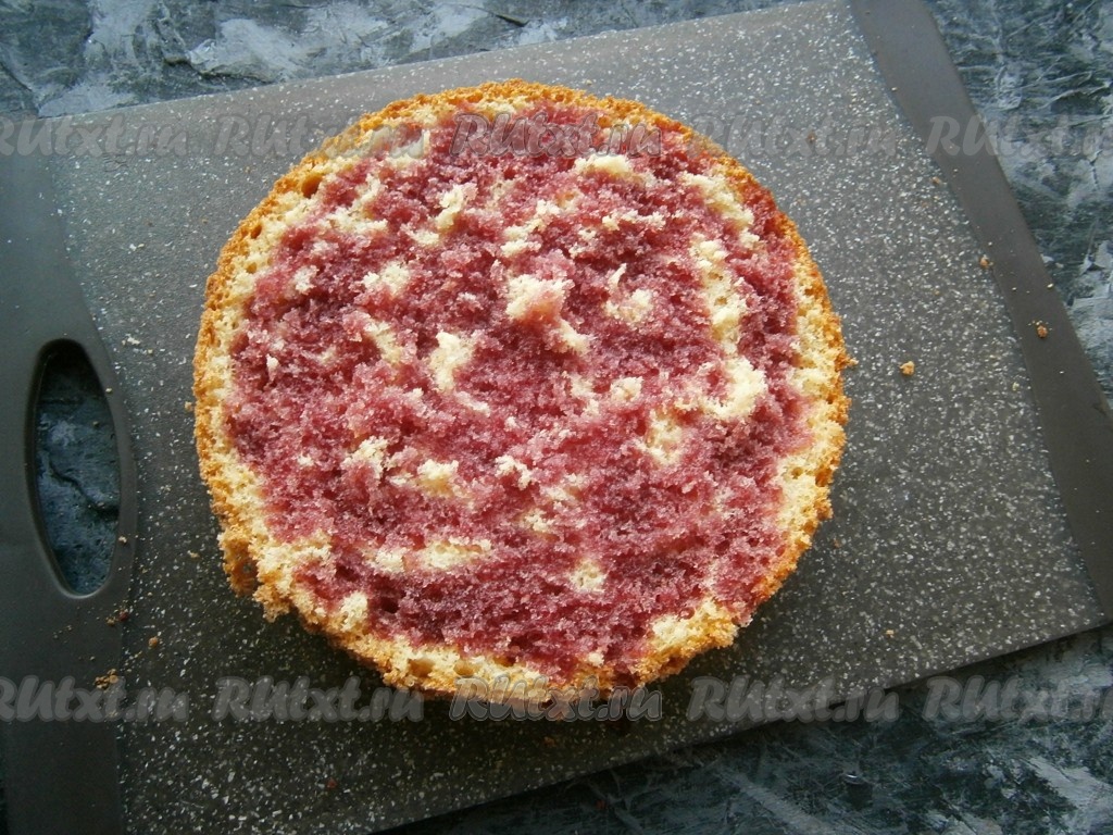 Пропитать каждую часть белого бисквита вишнёвым сиропом.