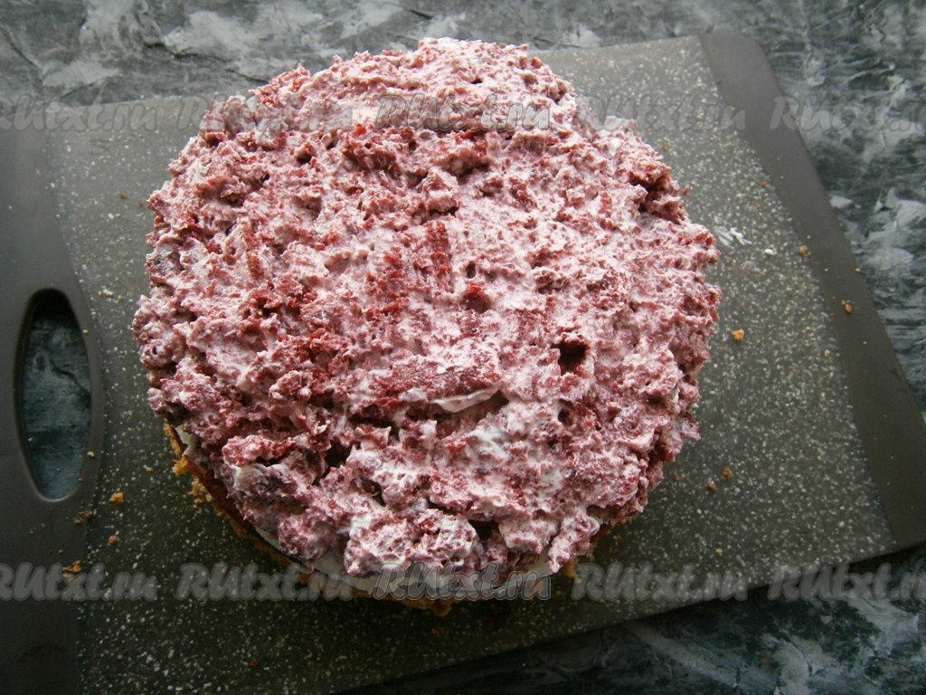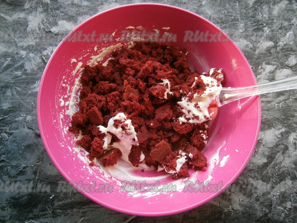 Срезать с красного коржа "шапочку", поместить в чашу блендера и измельчить до крошки.