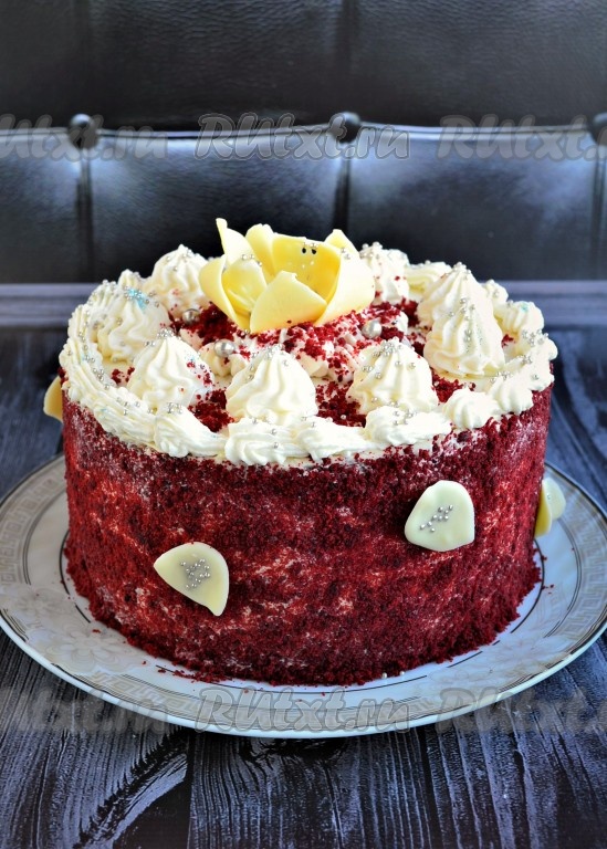 Затем отправить торт "Искушение" снова в холодильник минут на 30. И далее торт украсить сверху кремом, который мы оставляли для украшения. Я ещё сделала из белого шоколада цветок и лепестки, украсила бусинками и немного - красной крошкой. Замечательный, интересный, необычайно вкусный, влажный торт "Искушение" поместить в холодильник ещё как минимум часов на 5-6.
