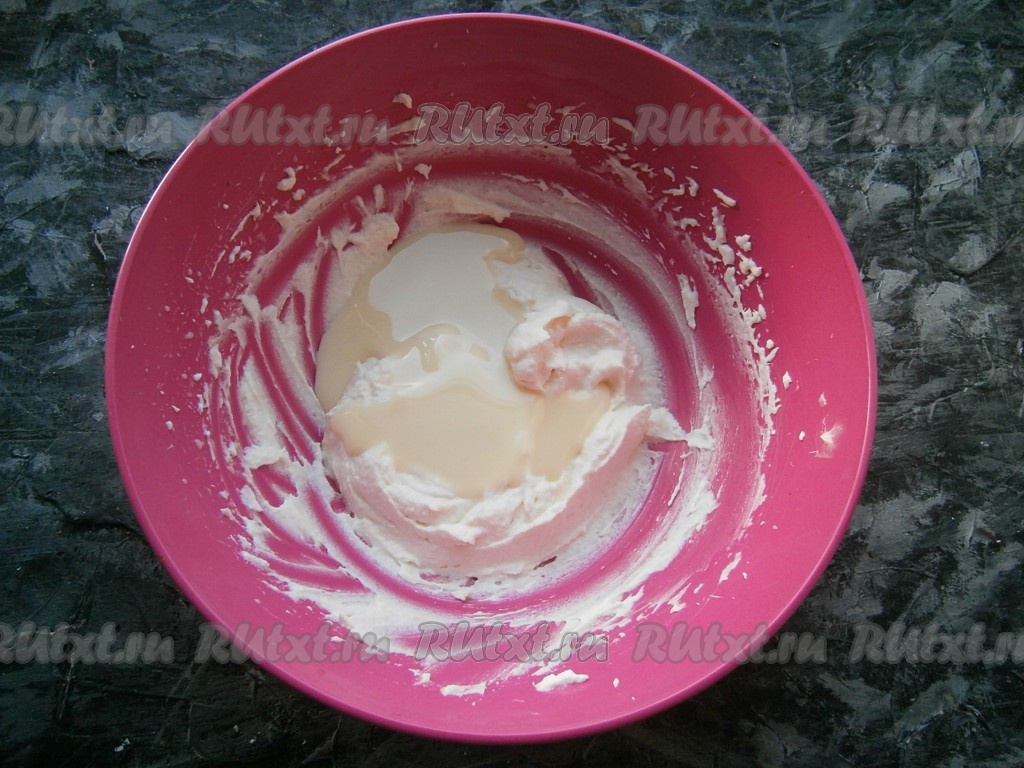 1/3 крема отложить в миску, добавить в него оставшиеся 50 грамм сгущёнки.