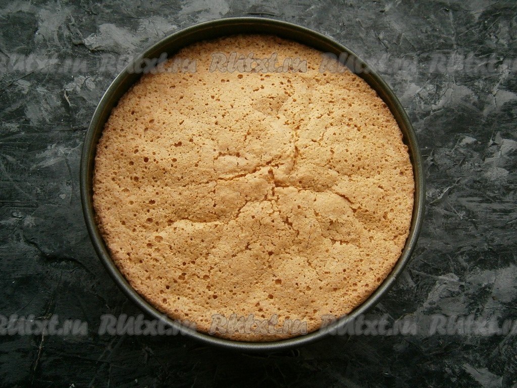Бисквит выпекать в разогретой до 180 градусов духовке около 30 минут, после чего оставить его в форме на 10 минут, извлечь из неё и остудить.