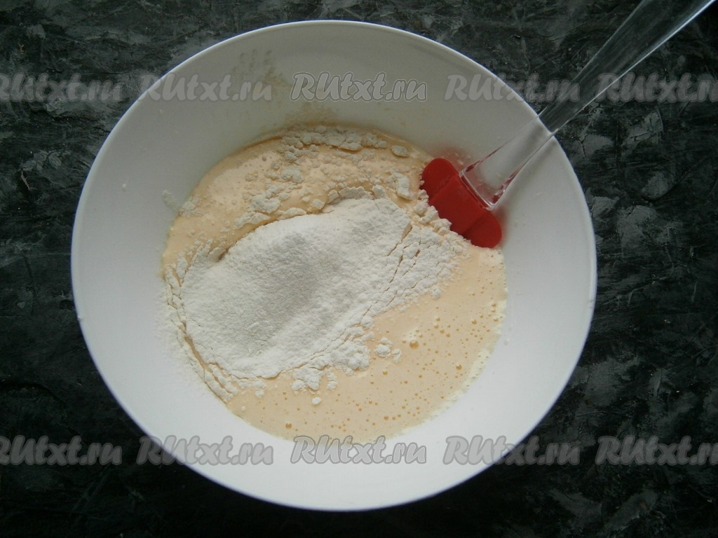 Частями просеять в яичную массу муку с разрыхлителем, каждый раз аккуратно и хорошо вмешивая муку с помощью лопатки.