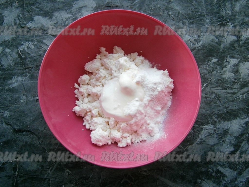 Теперь можно приступать к приготовлению крема, для этого нужно в творог добавить сметану и сахарную пудру.