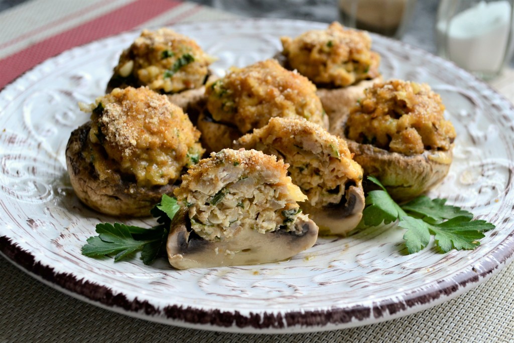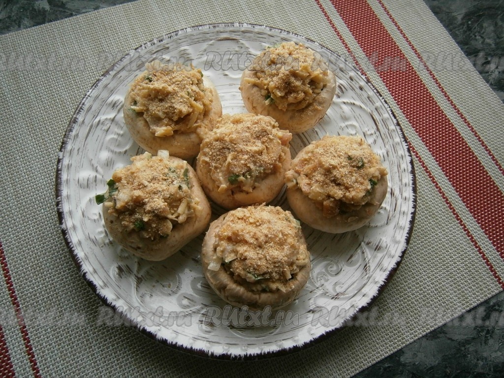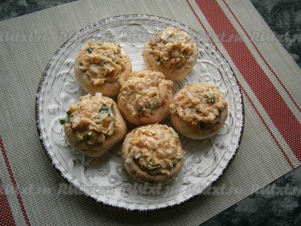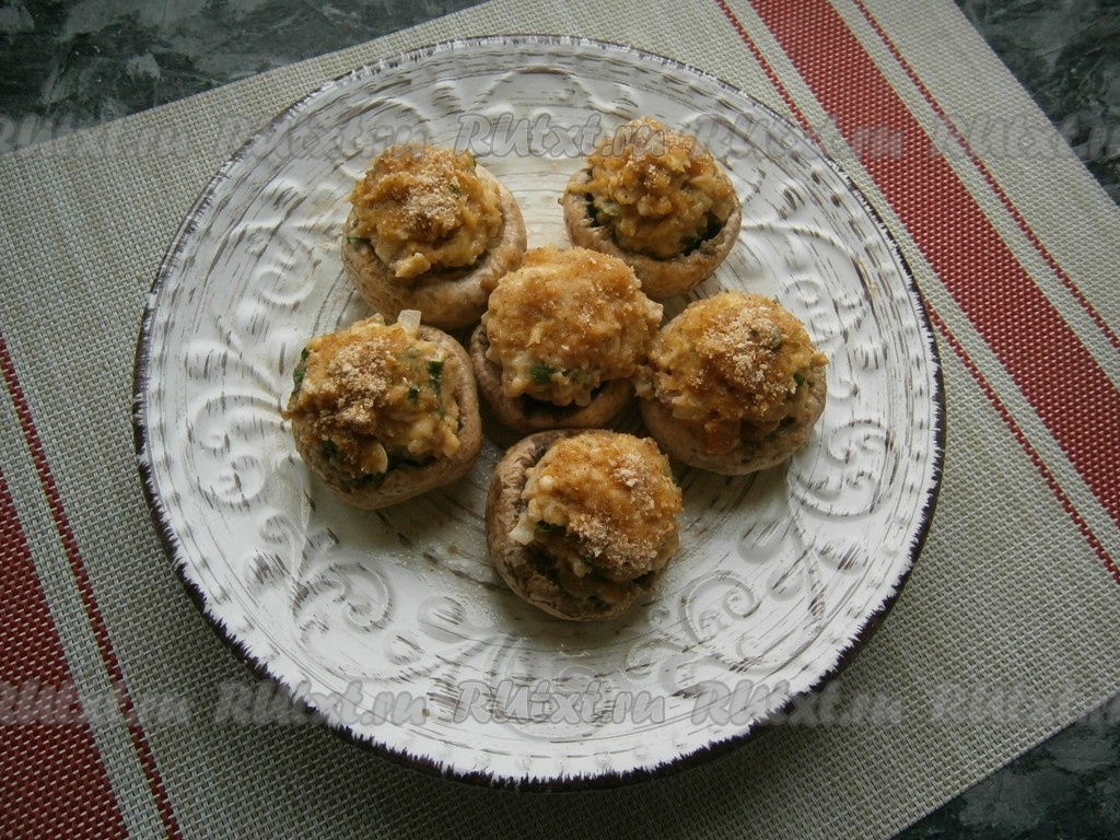 Полученной массой щедро (с горкой) нафаршировать шампиньоны, разместить их на тарелке, пригодной для готовки в СВЧ.