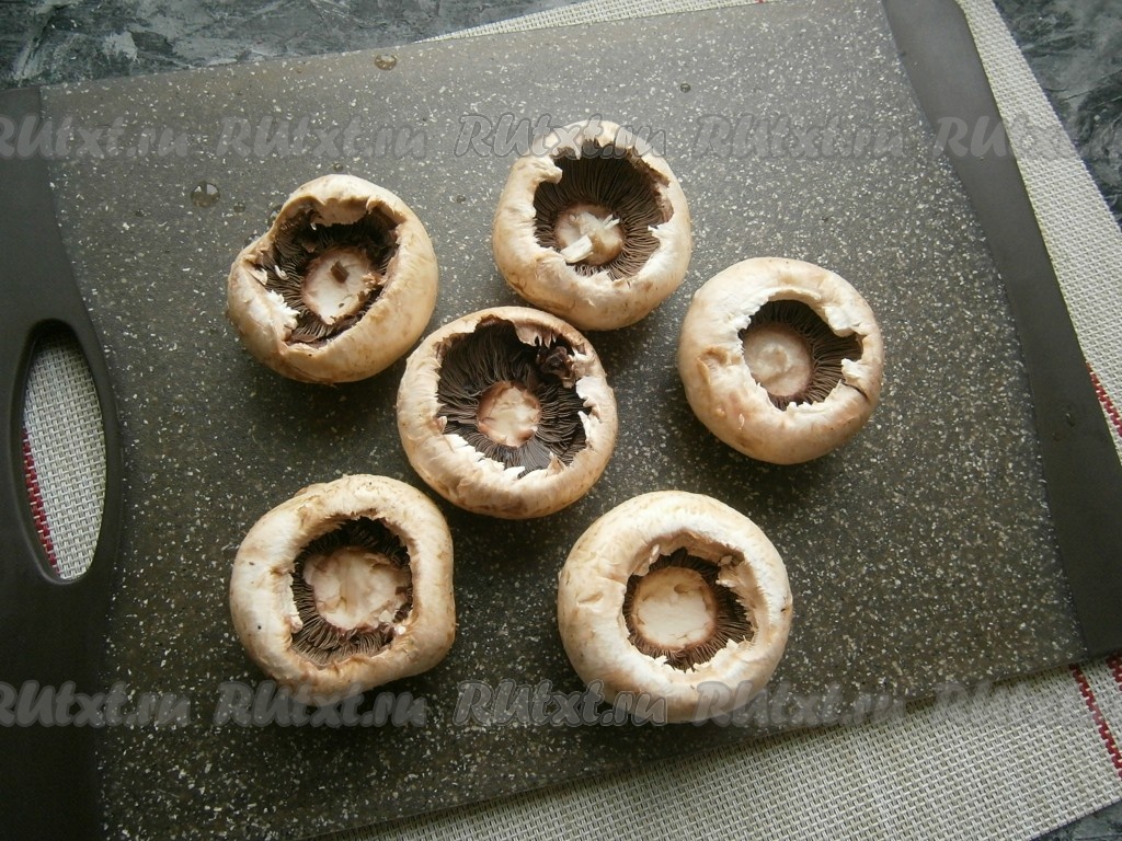 Лук и чеснок очистить. Крупные шампиньоны вымыть, обсушить, удалить ножки так, чтобы в грибах получилось отверстие. Внутри шампиньоны немного посолить.