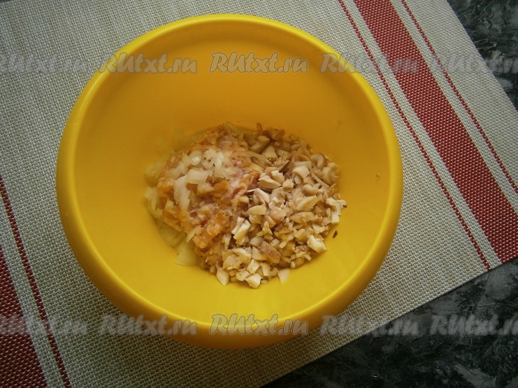 К фаршу добавить мелко нарезанный лук и половину мелко нарезанных ножек, которые были удалены.