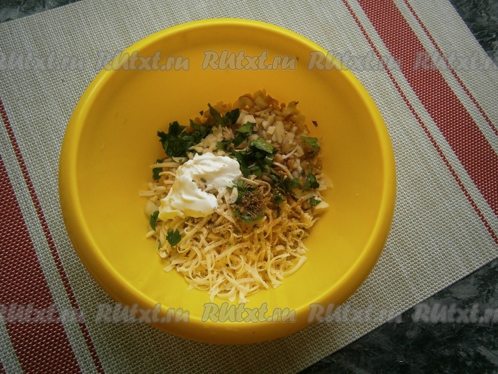 Сюда же добавить натёртый на средней (или мелкой) тёрке сыр, измельчённую петрушку, мелко нарезанный чеснок, сметану, соль, перец и хмели-сунели, влить соевый соус и оливковое масло.