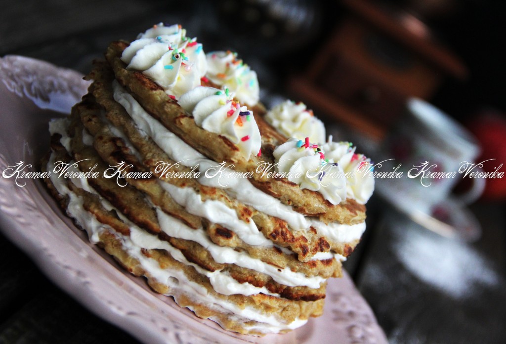 На смазанный овсяноблин выложить следующий овсяноблинчик и тоже смазать крем. Таким образом собрать торт. Верхний корж я смазывать не стала, а украсила его оставшимся кремом, предварительно выложив его в кулинарный мешок, и кондитерской посыпкой. Поставить тортик в холодильник на пару часов. Готовый очень вкусный и нежный торт из овсяноблинов нарезать и подать к чаю. Этот необычный тортик, наверняка, понравится многим!