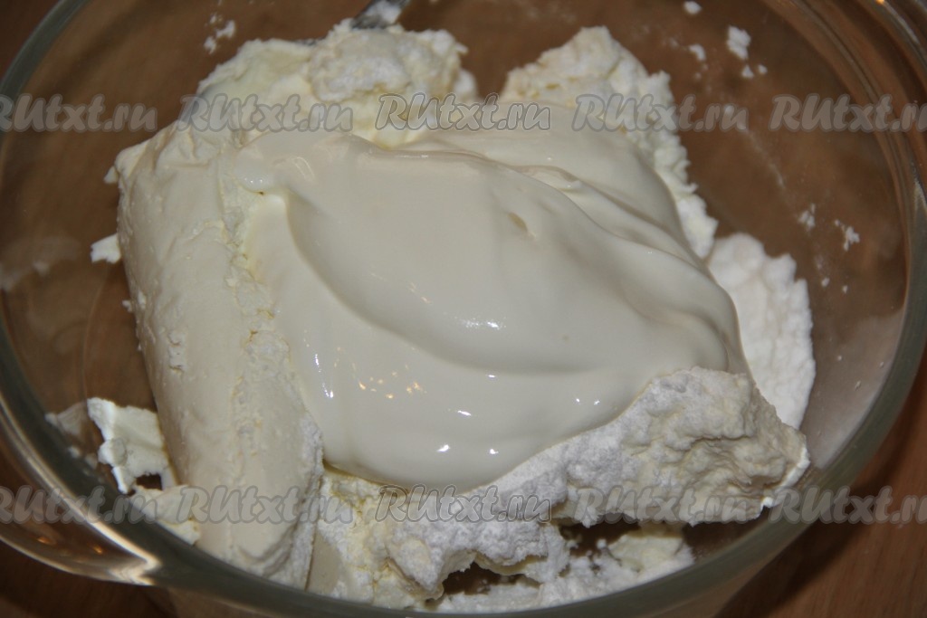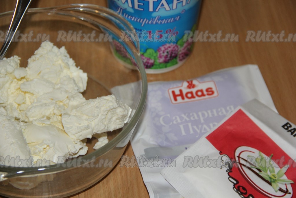 Для приготовления крема соединить творожный сыр, сахарную пудру и ванильный сахар.