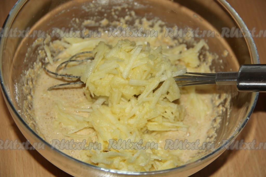 Натереть на тёрке яблоко, предварительно очищенное от кожуры, и добавить в овсяное тесто, перемешать.
