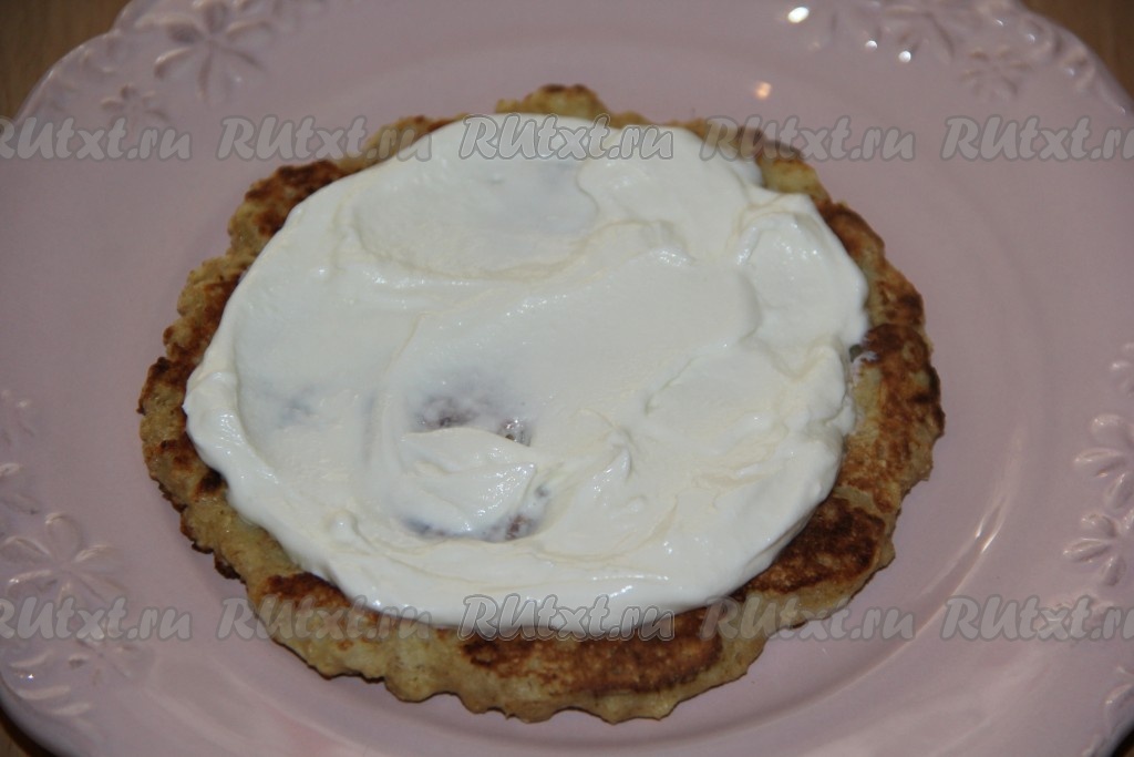 Выложить первый овсяноблин на плоскую тарелку, смазать кремом.