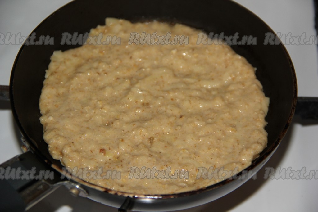 Я выпекала блины из овсянки на сковороде диаметром 12 см. Смазывала сковороду маслом перед жаркой каждого блина. На хорошо разогретую сковороду выложить немного теста и равномерно распределить его по сковороде.