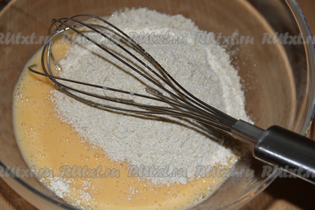 В смесь яиц и молока всыпать измельчённые овсяные хлопья, перемешать получившееся тесто.