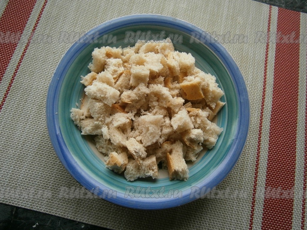 Хлеб белый (или батон) поломать на небольшие кусочки, выложить в миску.