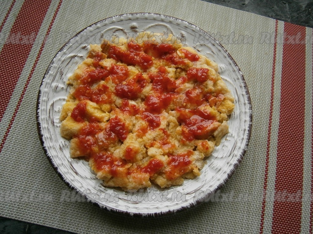 Аккуратно перемешать, чтобы каждый кусочек хлеба соприкоснулся с яйцом. Хлебную массу выложить на немного смазанную растительным маслом тарелку, пригодную для готовки в СВЧ, в виде круглой лепёшки. Смазать хлеб кетчупом (или томатным соусом).