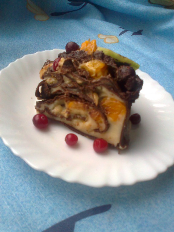 Блинный торт с фруктами и йогуртом отлично подходит и для празднования Масленицы, чтобы угостить родных и друзей, и для чаепития в кругу семьи. Тортик получается лёгким, воздушным, очень ароматным и нежным. Готовится он из тонких шоколадных блинчиков, хорошо держит форму, в разрезе выглядит ярко и очень нарядно. Начинку можно подбирать по своему вкусу и желанию.