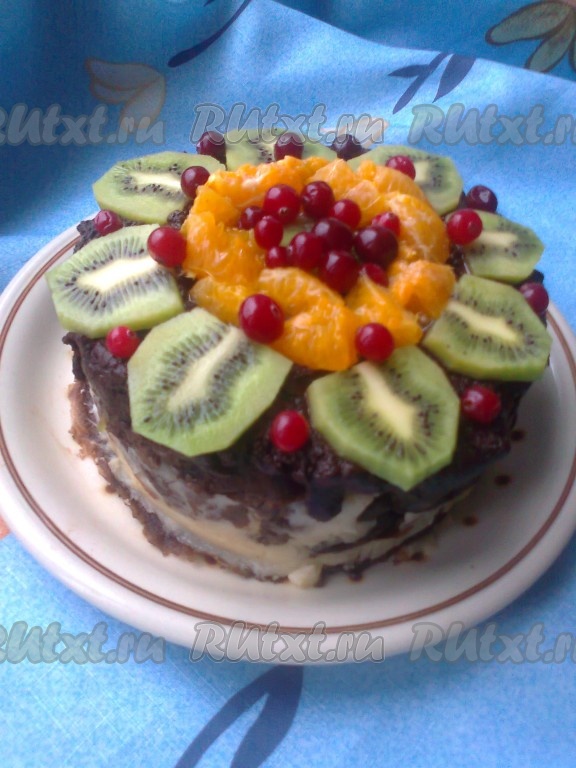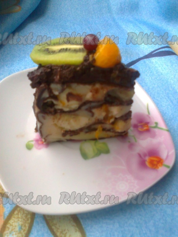 Поливаем растопленным чёрным шоколадом, украшаем фруктами, ягодами. Вот такой замечательный блинный торт с фруктами и йогуртом у нас получился.