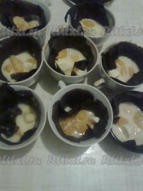 Остальные 8 блинов выкладываем по одному в 8 чашек (или любую подходящую посуду). В каждую чашку поверх блина кладём восьмую часть от всех нарезанных фруктов и заливаем йогуртом с желатином. Часть йогурта с желатином оставляем для заливки верха торта.
