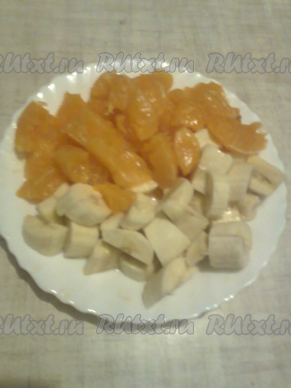 В начинку для торта можно использовать фрукты или ягоды на ваше усмотрение. Я использовала банан и мандарин. Режем очищенные фрукты на кусочки.