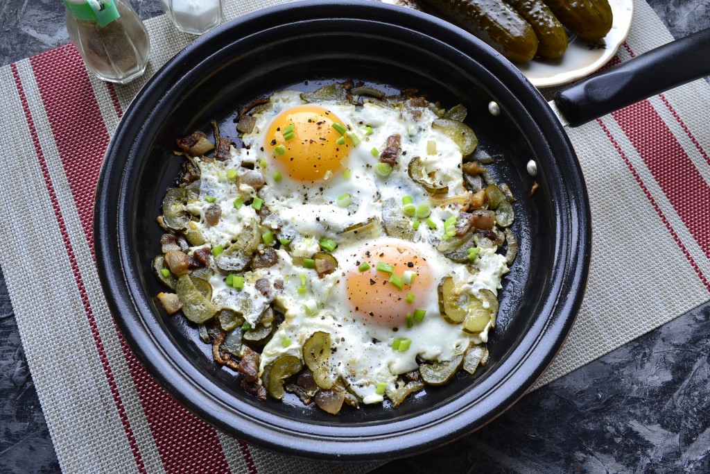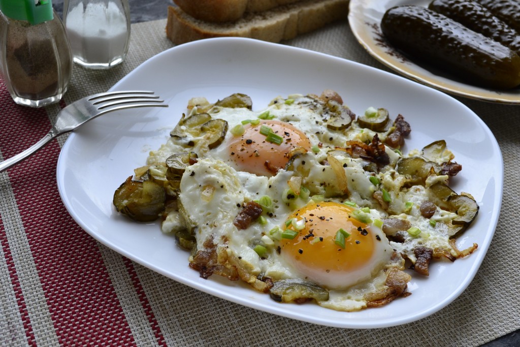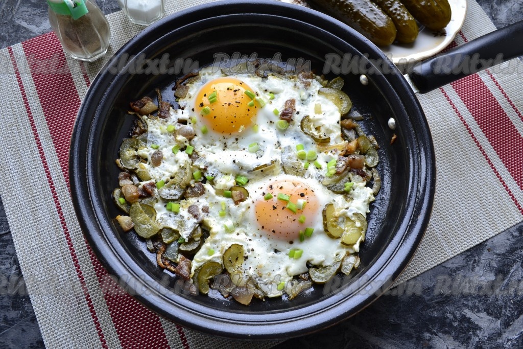 Предлагаю вам приготовить на завтрак наивкуснейшую яичницу с солёными огурцами. Это блюдо готовила моя бабушка в деревне, а сейчас его обожает мой муж. Да, яичница, конечно, получается достаточно калорийной, но и необычайно вкусной! Огурчики нужны именно солёные, желательно бочковые, тогда вкус будет потрясающим. Вместо сала можете использовать любой другой жир.