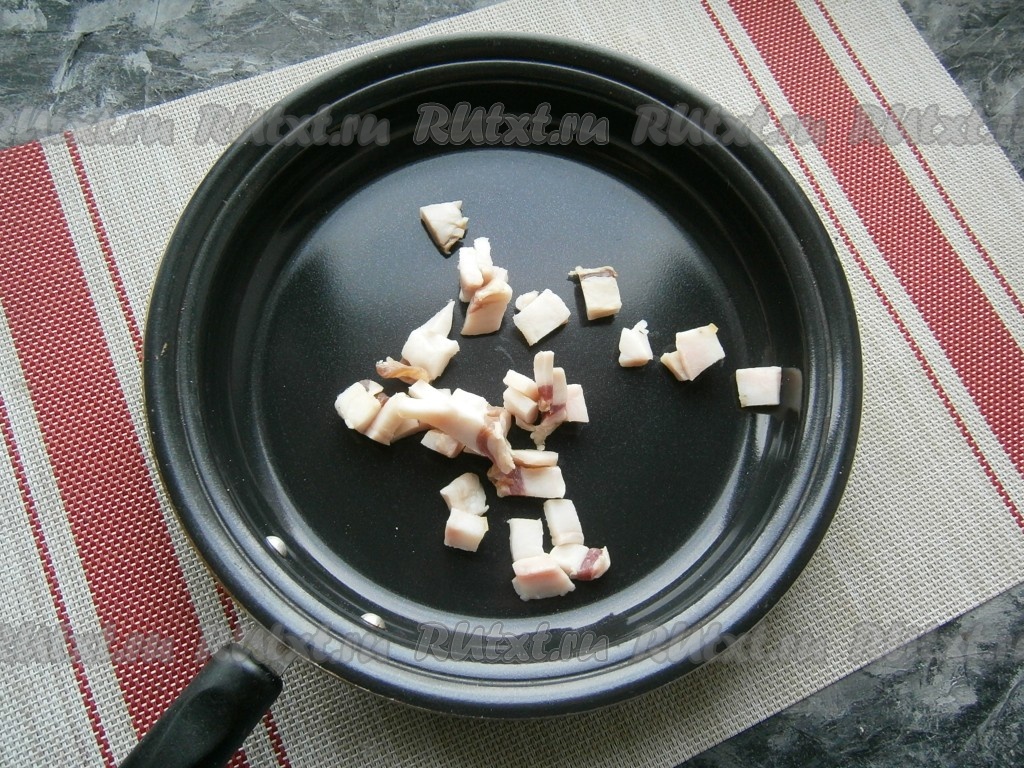 Свежее сало нарезать небольшими кусочками, выложить в сковороду.