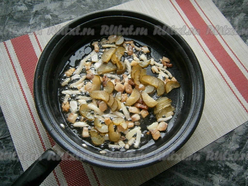 Солёный огурец нарезать тонкими полукружочками и добавить в сковороду. Обжаривать огурчики с луком, помешивая, около 3-4 минут на небольшом огне.